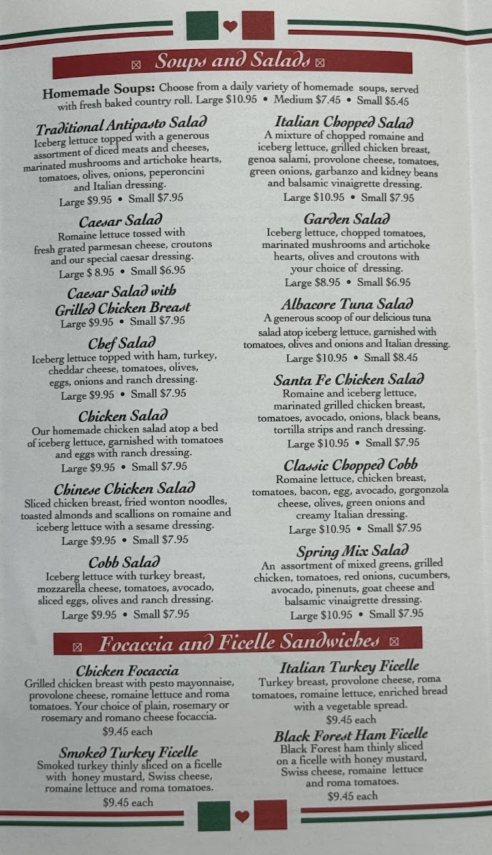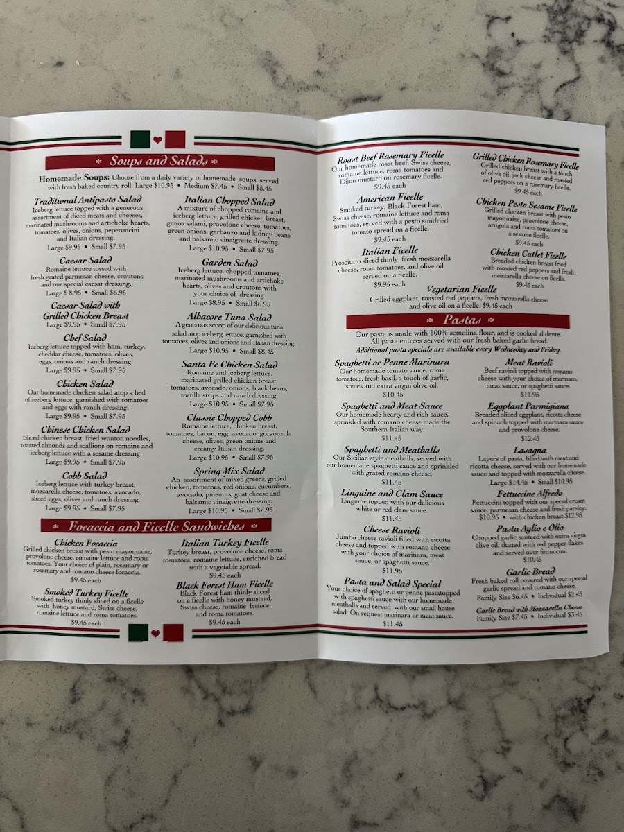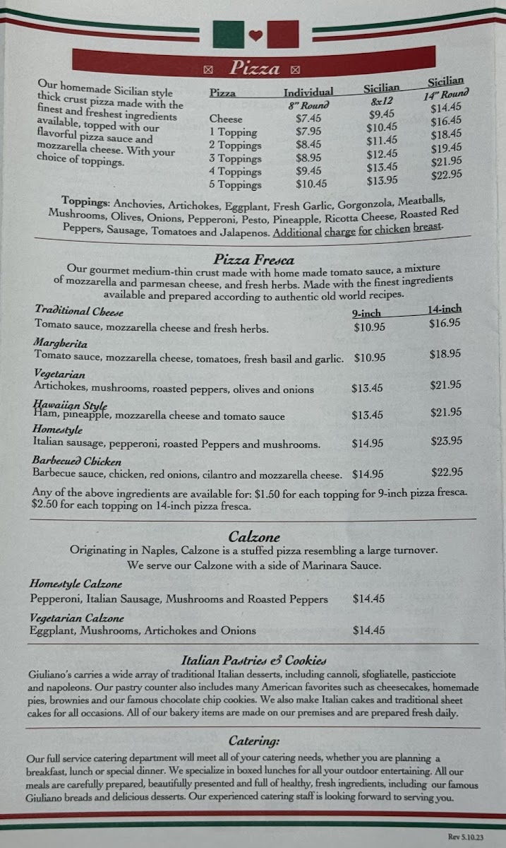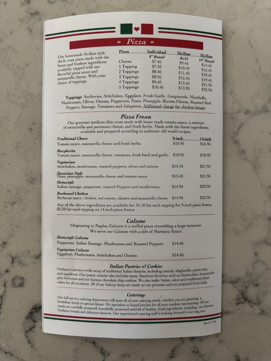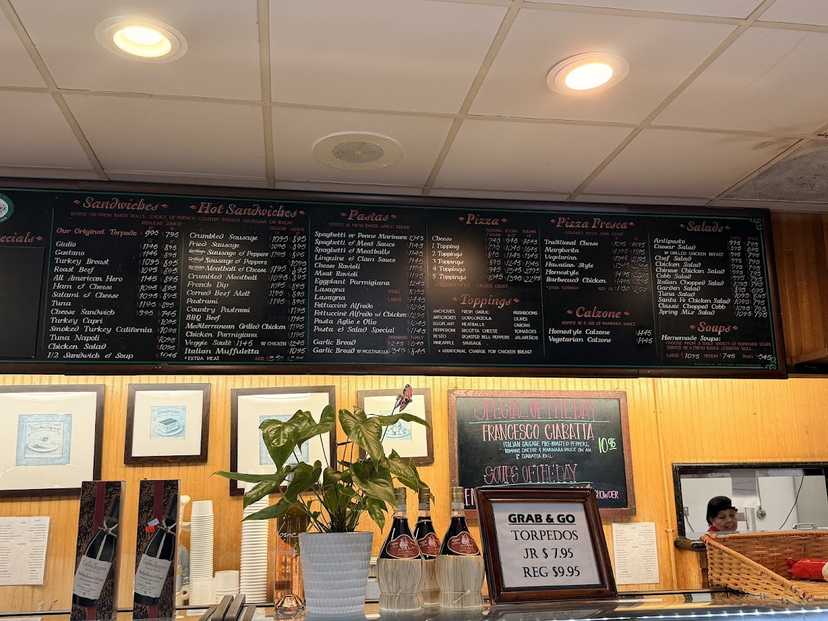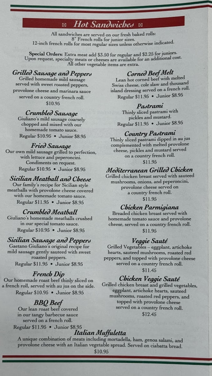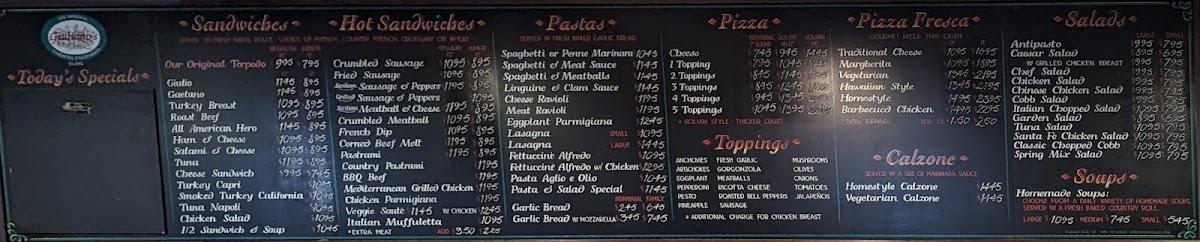 The menu at The Original Giuliano's Delicatessen offers a variety of Italian-inspired deli selections, bakery items, and takeout options, suitable for lunch and casual meals. It features a range of sandwiches including focaccia and ficelle varieties such as Smoked Turkey Ficelle, Italian Turkey Ficelle, and Black Forest Ham Ficelle. Classic and specialty sandwiches like the Original Torpedo, Pastrami, Giulio, Crumbled Meatball, and Philly Cheese Steak are also available.